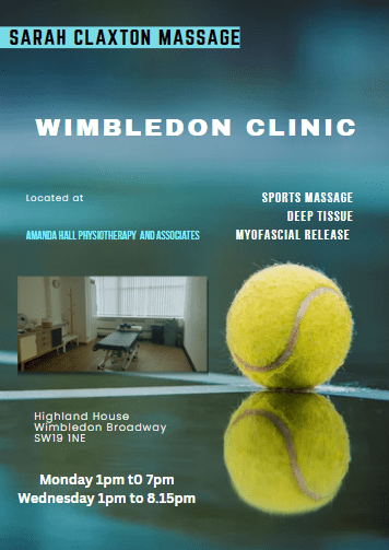 My Wimbledon practice is located at The Whole Being Physio. My clinic times are Mondays 1pm to 7pm and Wednesdays 1pm to 8.15pm.